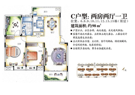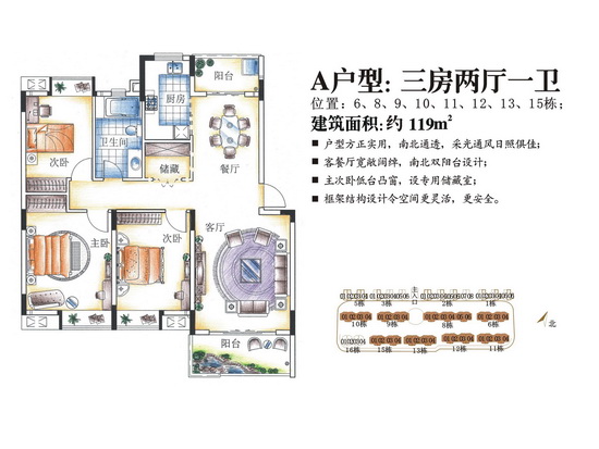 三期项目占地约2.4万平方米,总建筑面积约4万平方米,总户数373户,由13栋全框架结构多层洋房组成和2300平方米商业街区,户型面积69-159平方米不等,主力户型为89㎡的两房和119㎡的三房。厅房门窗全部为中空玻璃,公司统一安装并赠送太阳能。