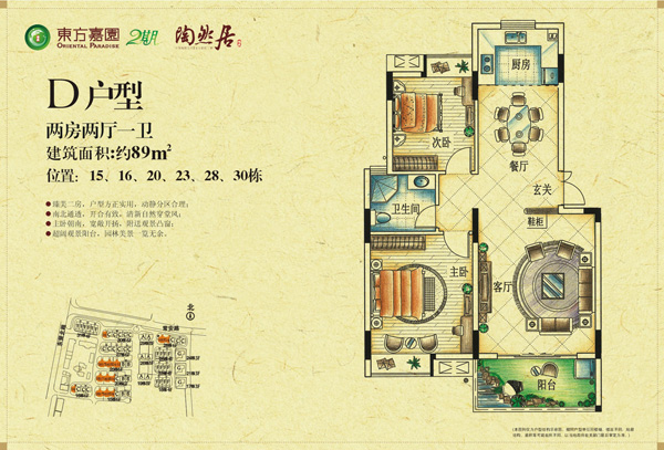 “陶然居”是鸿威(宜兴)房地产开发有限公司开发的东方嘉园二期工程,位于宜兴市丁蜀镇东坡路北侧。建筑面积为50000多平方米,共17栋,311户,其中多层为7栋(5+1层)、叠层4栋、小高层3栋(7+1层)、别墅3栋及半地下室汽车车库。底层均为车库,上部是住宅。多层和小高层的顶层是阁楼层,建筑装饰主要为外墙采用陶瓷砖及部分天然石材装饰,具有明净、古朴的特色,青灰色水泥瓦坡屋面结构与一期相应,建成后和一期合并成为独立的,封闭的小区,是当地理想的人文社区。