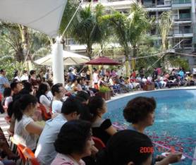 酒会在小提琴优美的旋律中拉开帷幕。酒会中,鸿威集团董事长李波先生亲临现场对项目业主的长期支持表示感谢。酒会在鸿景翠峰花园的天际泳池周围举行,围绕泳池摆设的客户席,让购房客户在欣赏优雅歌舞节目的同时,充分体验了浓郁的泰式园林风情。