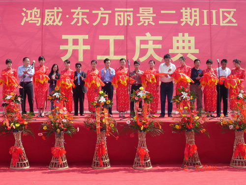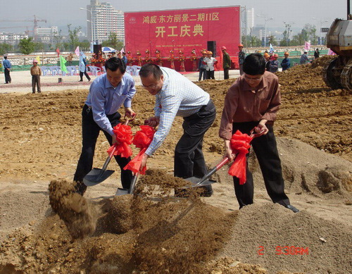 上午9:18分,开工庆典仪式正式开始。黄山市工商联合会主席吴云鹤先生、黄山市鸿维房地产有限公司总经理李涛先生、浙江省长城建设集团公司俞向阳先生、中外建天利(北京)工程监理咨询有限公司潘略生先生分别发表了热情洋溢的讲话,向鸿威·东方丽景二期Ⅱ区工程的开工建设表示热烈祝贺。黄山市建委、市城市规划局、市国土资源局、市房地产管理局、市商务局、市旅游度假区管委会等主管部门的领导,为鸿威·东方丽景二期Ⅱ区高层项目开工剪彩,并在鞭炮声中挥锹培土,为项目开工奠基。