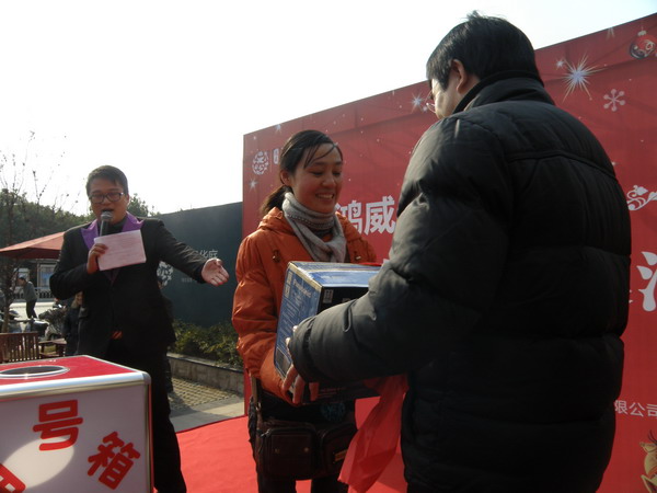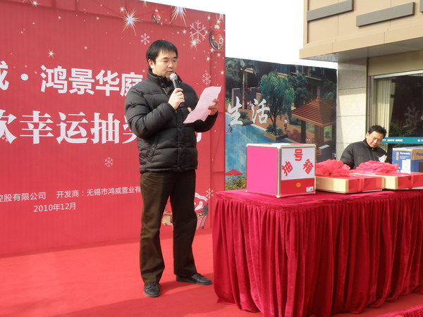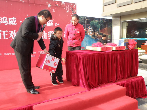 10点半,在三百多名业主们的期待中,活动正式开始,现场可以用热烈与欢乐来形容。在无锡市鸿威置业有限公司工程部张总监发言后,抽奖活动正式开始。50名的纪念奖,全部由现场的小朋友们来抽取,获奖的业主们开心地从营销部胡经理的手中接过奖品,而孩子们的童真赢得了全场阵阵的欢笑声。随后,三等奖、二等奖的抽取给业主们带来了一个又一个惊喜,期间穿插的小朋友们参与的小游戏,给大家带来了童年的回忆。最后,由张总监抽取了幸运的一等奖,松下超薄组合音响,获奖的女业主原本已在准备离开,不料却被幸运之神撞了一下腰。