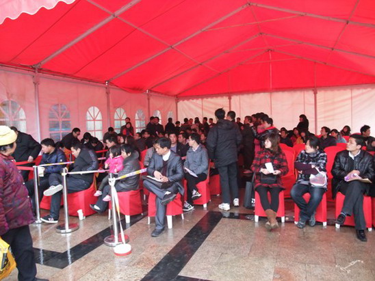 淅淅沥沥的阴雨从前一天就开始下起,但这并不能阻挡客户们的热情。不到8:30,销售现场的广场临时大棚里就坐满了前来购房的客户。为了拿到比较好的选房位置,一些性急的客户甚至早晨5点多就来排队了。截至上午9点,仍然有客户陆陆续续到来,并不断询问售楼人员项目的情况。