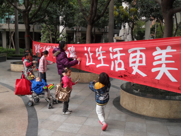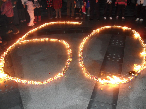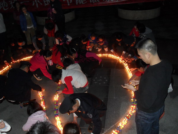 20:30分小区二层与五层公共照明准时熄灯,黑暗下业主/住户和小区的孩子们纷纷点亮蜡烛,构成“60”图案,围绕着火光,孩子们激动不已,欢欣鼓舞;有的业主/住户闭上眼睛,默默地为地球真诚祈祷。管理处工作人员给孩子们讲解爱护环境、爱护地球的重要性,大家积极参与,活动现场气氛热烈欢快。