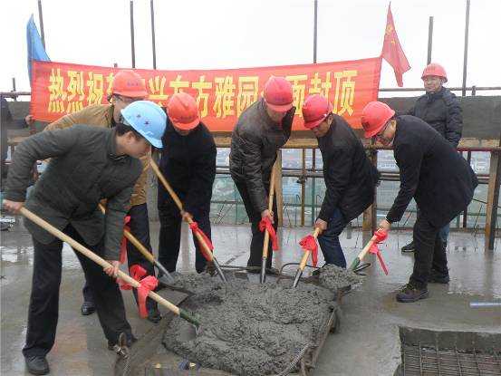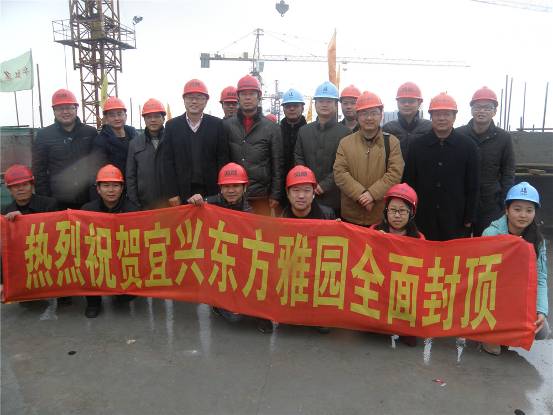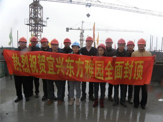 2014年1月8日,东方雅园项目现场鞭炮齐鸣,彩旗飘扬,一片欢腾景象。11时18分,东方雅园项目封顶仪式隆重举行,宜兴公司总经理李涛、总经理助理陆亚军、各部门负责人以及总包单位领导、监理公司、设计院、银行等各相关合作单位领导共同出席了封顶仪式,一起见证了东方雅园全面封顶这一喜庆时刻。