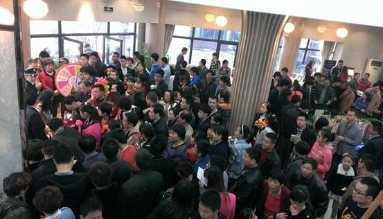 为展示宜兴·东方雅园良好的品牌形象,提升品牌知名度,抢占五一传统黄金周的市场先机,促进销售,宜兴东方雅园销售中心及样板房于4月27日盛大开放。在公司领导的正确领导和集团设计中心、工管中心等相关部门的大力支持和精心指导下,宜兴公司通过精心策划、严密组织,各部门通力合作,克服了时间紧、连续阴雨天气等重重困难,顺利实现了销售中心和样板房开放这一关键节点。本次活动共吸引了206批客户约四百人到场,虽然销售中心场地局促,但现场气氛火爆且秩序井然,到访业主对鸿威品牌和东方雅园的产品、样板房装修、现场包装及氛围给予了很高的评价。活动当天积累了10多批意向客户,并当场成交1套,为落实集团“销售年”的重要举措和宜兴公司年度销售目标迈出了坚实的第一步。