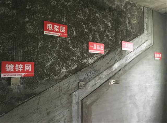 墙体抹灰工序样板,严格按工艺顺序分层展示、标识清楚,确保各工序高效、优质完成。