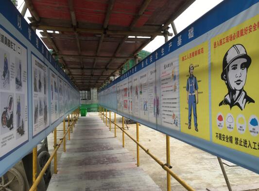 安全通道搭设合理,顶部双层防护,两侧设置安全宣传警示标语。