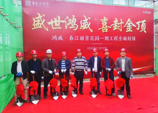 2020年11月19日,春江丽景项目现场鞭炮齐鸣,彩带飘扬,一片欢腾景象。上午10时58分,春江丽景花园一期项目全面封顶仪式隆重举行;黄山公司常务副总经理汪友文、集团经营发展中心副总经理兼黄山公司副总经理胡明海、黄山公司副总经理江明、公司各部门负责人以及总包单位、监理公司领导和黄山多家主流媒体齐聚封顶仪式现场,共同见证鸿威春江丽景花园一期全面封顶这一喜庆时刻。